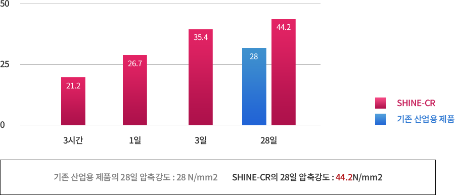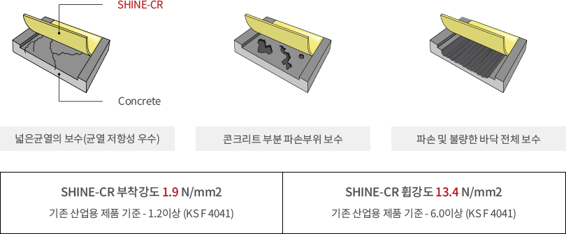 SHINE-CR은 초속경 고강도의 콘크리트 전문보수재로 100% 무기질 세라믹시멘트입니다. SHINE-CR은 별도의 프라이머 없이 물과 혼합하여 바로 사용할 수 있고 시공 후 2~3시간 안에 가벼운 통행이 가능하여 시공에 대한 비용 및 시간을 절감하는데 탁월한 효과가 있습니다.