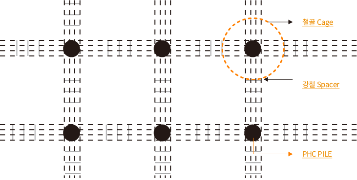 S.O.P(Slab on Pile)에서는 Pile 간격에 따라 파일상부 주열대에 철근 보강