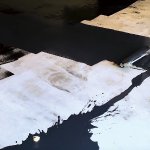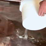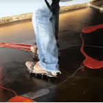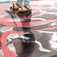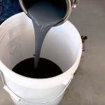 -프라이머가 완전히 경화된 것을 확인 후 스파이크 슈즈를 신고 혼합 용기가 빌 때까지 자재를 걸으면서 리본 모양으로 자재를 부어줍니다. 자재를 시공하기 전 혼합된 각각의 자재를 바닥에 자유롭게 부어 줍니다.